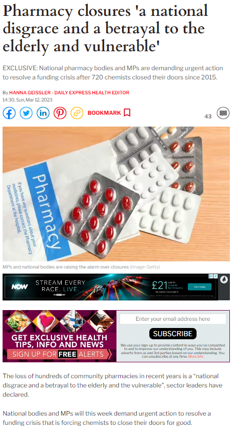 The Daily Express reports on the efforts of both the national pharmacy bodies and MPs who are demanding urgent action to resolve the funding crisis in the pharmacy sector. This includes an MP letter to the Prime Minister co-ordinated by the All-Party Pharmacy Group (APPG) and a new public petition.