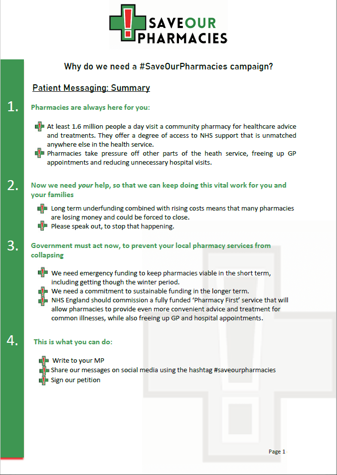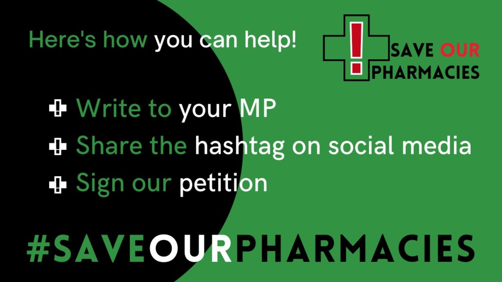 We urgently need your support to ask MPs from all political parties to support our cause to get pharmacies the funding they need to keep their doors open.